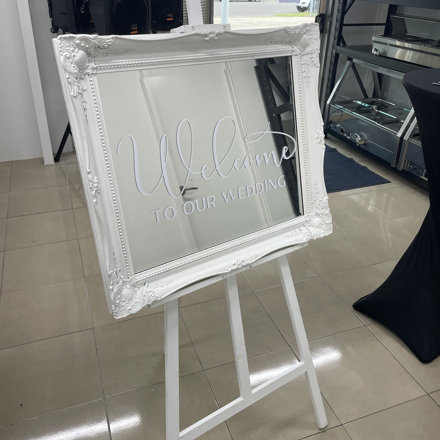 White easel including mirror with Welcome To Our Wedding stencil